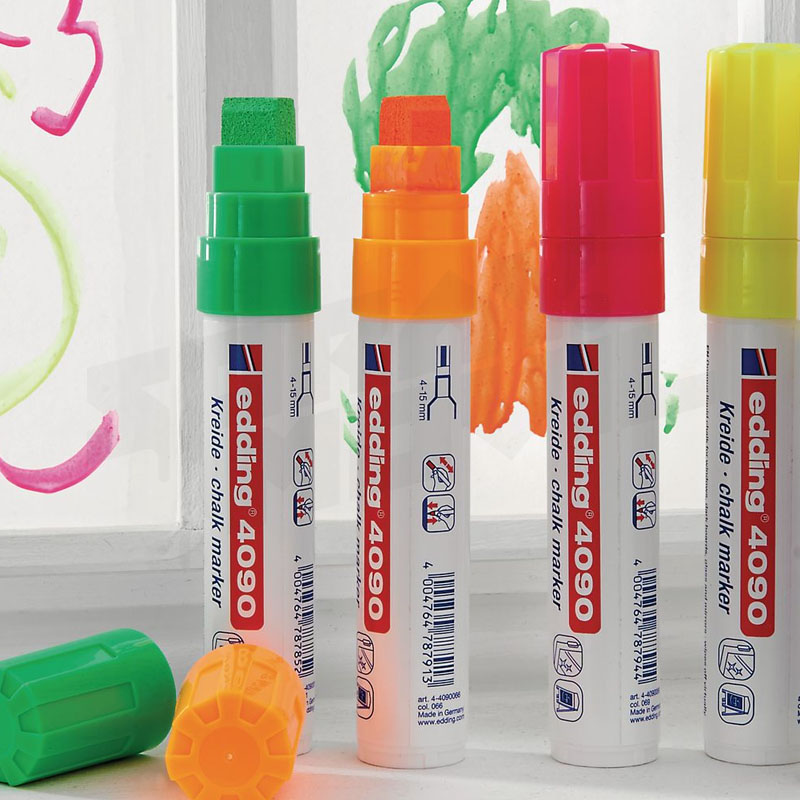 Marcador de tiza para diseñar, decorar y escribir con trazo grueso y de forma no permanente sobre superficies no porosas, tales como ventanas, pizarras oscuras, vidrio, plexiglas® y espejos