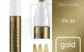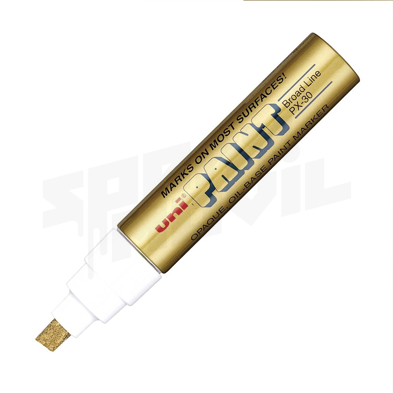 El marcador Uni Paint PX-30 cubre extremadamente bien casi cualquier superficie y es resistente a la intemperie, resistente a la decoloración y recargable. La pintura es una pintura a base de aceite altamente permanente y el marcador viene con una punta biselada de 8 mm.