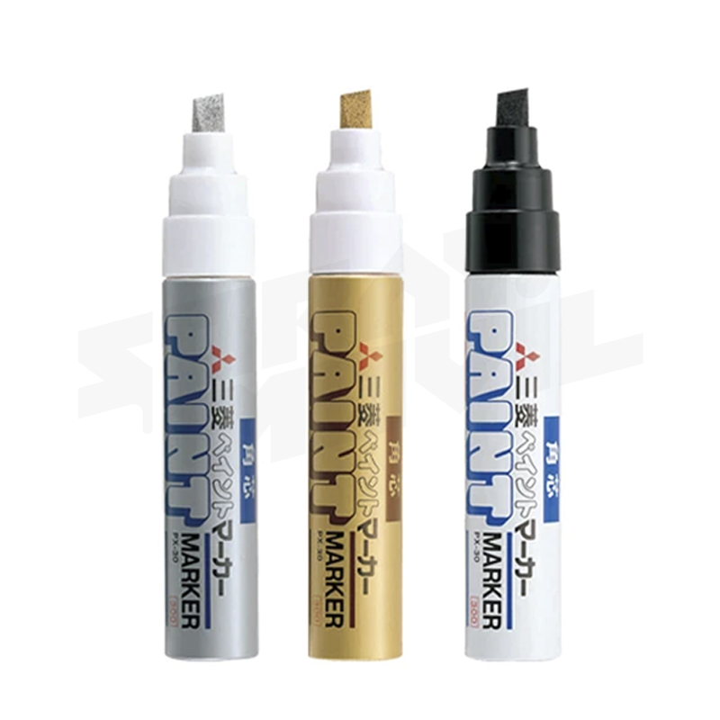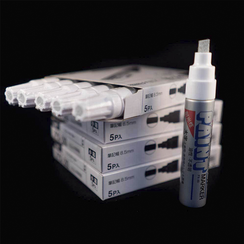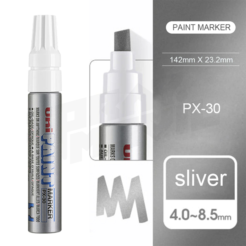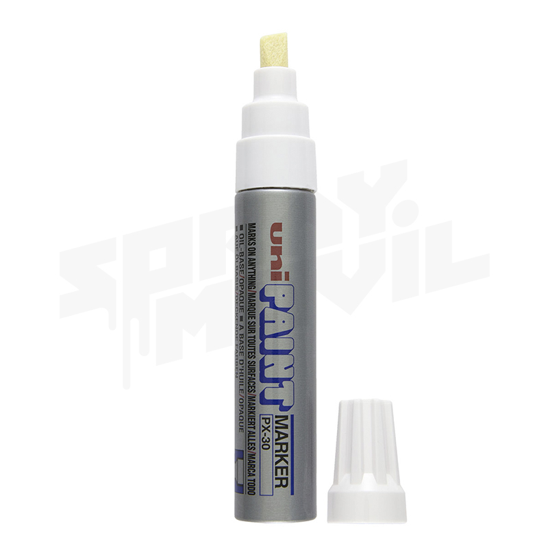 El marcador Uni Paint PX-30 cubre extremadamente bien casi cualquier superficie y es resistente a la intemperie, resistente a la decoloración y recargable. La pintura es una pintura a base de aceite altamente permanente y el marcador viene con una punta biselada de 8 mm.